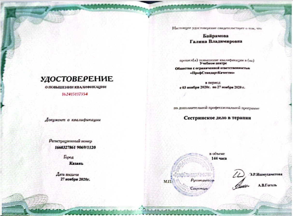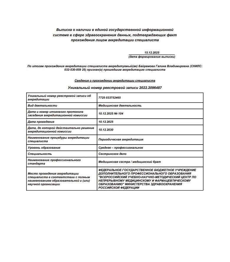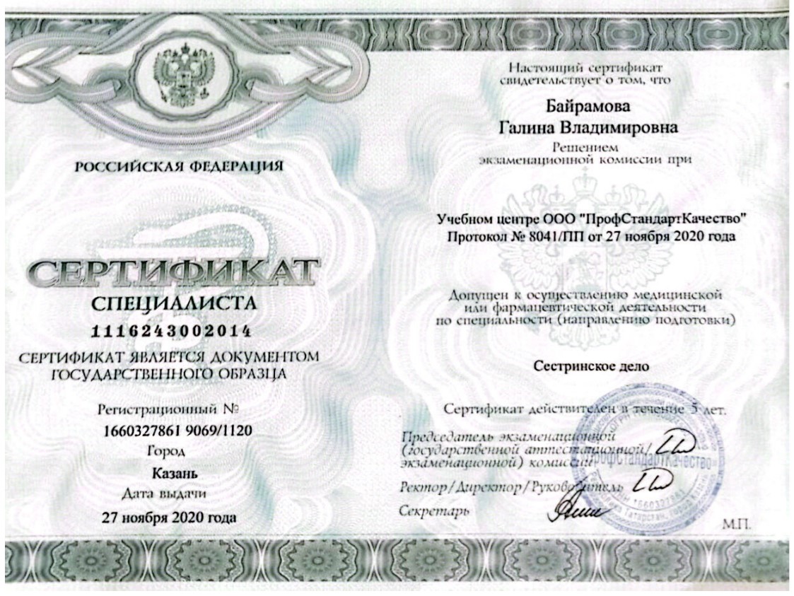 Медицинская сестра. Стаж более 30 лет. Специалист с большим практическим опытом в терапевтическом профиле и организации сестринского дела. Имеет действующую аккредитацию по специальности.